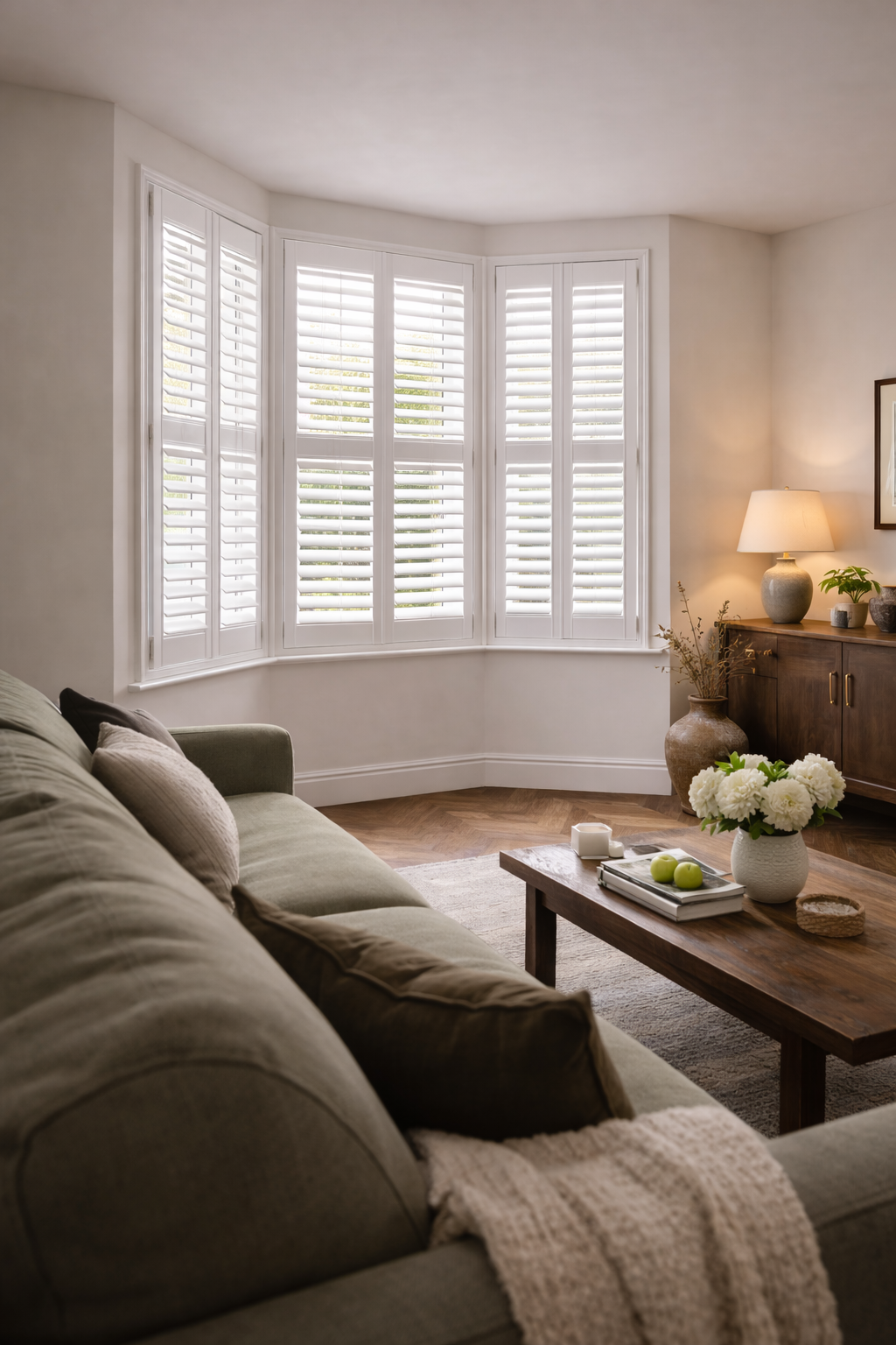 | Full Height Bay Window Shutters | Solid panels fitted inside each section, creating strong vertical lines | Structured, balanced and visually complete | Living rooms or front-facing bays | Panel size and louvre width should suit the scale of the window |